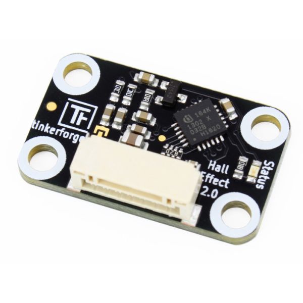 The Hall Effect Bricklet extends Bricks and can magnetic flux density (magnetic induction) from -7mT to 7mT (milli Tesla). It can count the (dis-)appearances of magnetic fields and can for example be used to measure the speed of a wheel with attached magnet with a frequency of up to 10kHz.