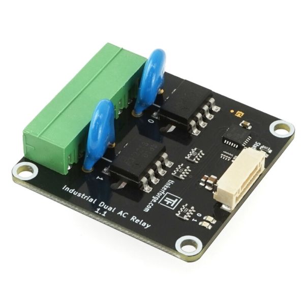 The Industrial Dual AC Relay Bricklet can be used to extend the features of Bricks by two solid state relays (SSR). Each relay has two terminals. The state is visualized by a LED.