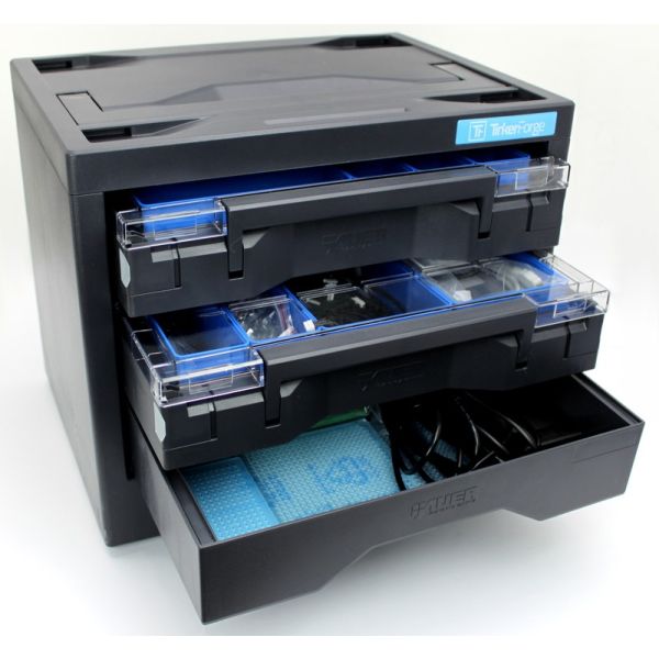 It comes including a professional set of storage boxes. You can easily carry the kit around with you or hang the box on a wall. In any case, you will always be able to nicely store a complete assortment of industrial Tinkerforge building blocks.