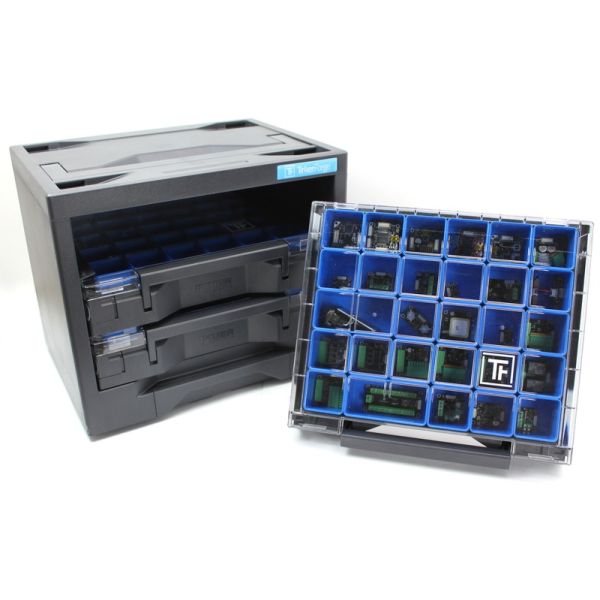 It comes including a professional set of storage boxes. You can easily carry the kit around with you or hang the box on a wall. In any case, you will always be able to nicely store a complete assortment of Tinkerforge building blocks.