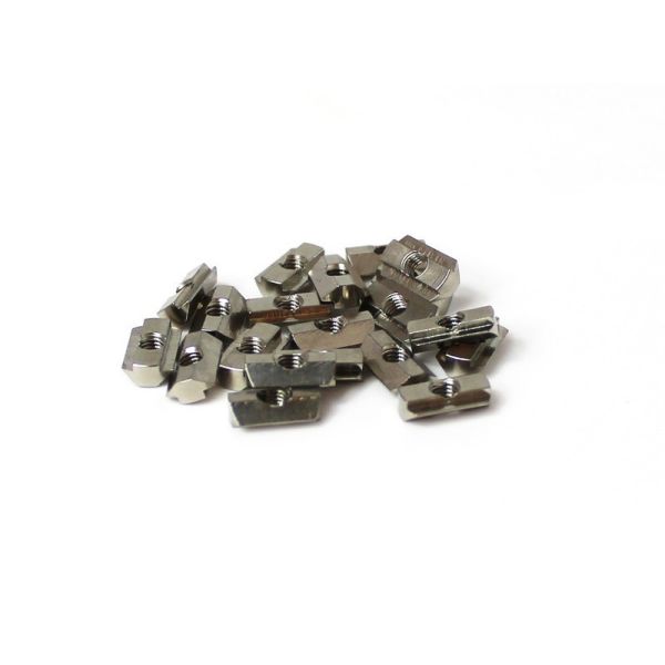The MakerBeam T-slot nut is made of stainless steel and was specially designed to slide into the T-slot grooves of the MakerBeam aluminum profile. The T-slot nut is great to fasten brackets or corner cubes. For these two purposes the nuts come with two types of bolts.