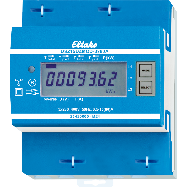 Es handelt sich um einen Eltako DSZ15DZMOD-3x80A Zweirichtungs-Multifunktionsstromzähler mit RS485 Modbus RTU Schnittstelle. Der Zähler ist MID geeicht.